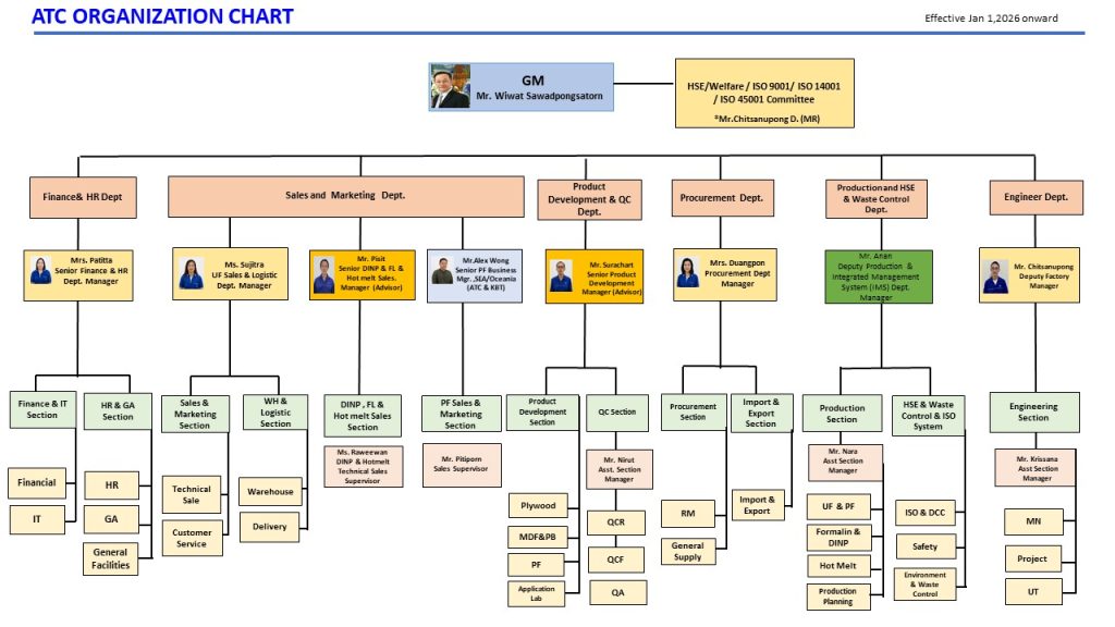 COMPANY BIOGRAPHY 1971: Registration of Thai Chemical Corporation Ltd. as a Thai-Japanese joint venture company.1973: Start Construction of three plants.Early 1974: Launch of 1st plant, producing plasticizer.Mid 1974: Launch of 2nd plant, producing resins.End 1974: Launch of 3rd plant, producing formalin. AICA ACQUIRED 60% STAKE IN THAI CHEMICALS LTD. IN MARCH 2018 NEW PF RESIN REACTOR OPENED CEREMONY AUG 28, 2019 AICA ACQUIRED 100% OF SHARES NOV 30, 2021 **CHANGED ITS NAME FROM THAI CHEMICAL CORPORATION LTD. TO AICA THAI CHEMICAL LTD. IN JULY 2023** Our Products ATC ORGANIZATION Our Network